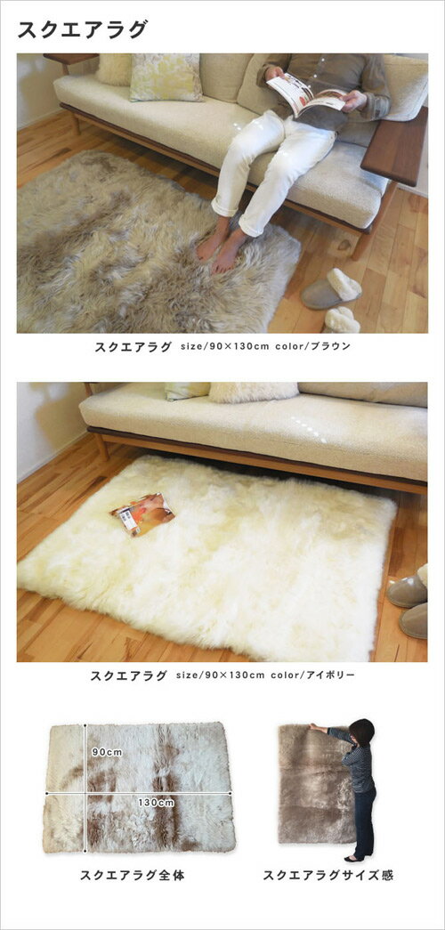 サイズ スクエアタイプ(四角) 90cmX130cm 素材 表面:ニュージーランド・オーストラリア産子羊原皮(ラムファー)使用中材:ポリエステル100%固綿裏面:ポリエステル70%・綿30% 全面滑り止め付き 生産 タイ製 備考 天然もののためひとつひとつ、毛並や色合いに違いがございます。