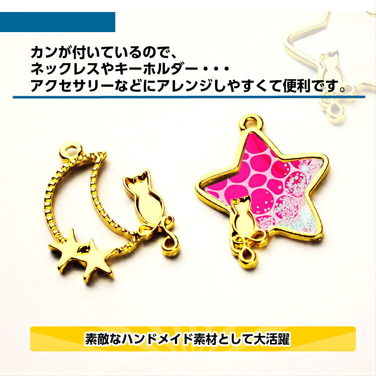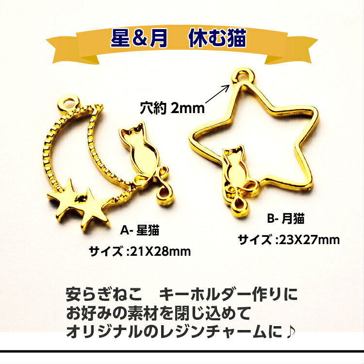 商品名レジン 枠 レジン空枠 レジンフレーム星&月 休む猫 数 量 1個 レジン 枠 レジン空枠 星&月 休む猫 サイズ:星猫 21X28mm 月猫 23X27mm 穴約2mm 1個入り カラー ゴールド 素材 合金 ※多少の誤差がある場合がございます。
